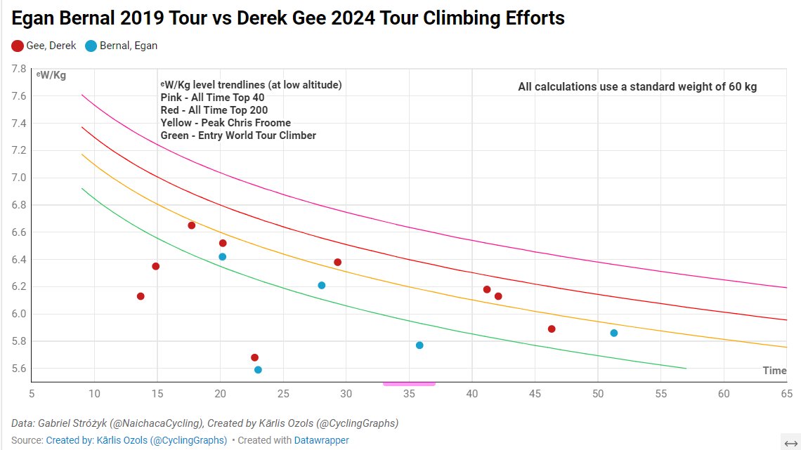 According to @CyclingGraphs on X, Derek Gee who finished 9th in 2024 Tour de France (+27min21s to Pogacar) would have won every Sky era Tour by more than 10 minutes. Egan Bernal in 2024 is around his 2019 level and he finished 29th in the 2024 Tour.